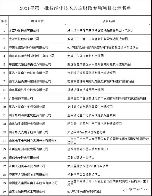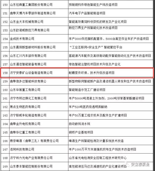 濟(jì)寧安泰礦山設(shè)備制造有限公司(簡(jiǎn)稱安泰泵業(yè))經(jīng)企業(yè)申報(bào)、各市推薦、專家評(píng)審等環(huán)節(jié),入選列入2021年第 一批智能化技術(shù)改造財(cái)政專項(xiàng)項(xiàng)目名單,公示時(shí)間為2021年10月11日-15日(5個(gè)工作日)。
