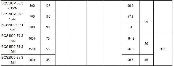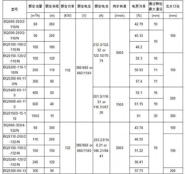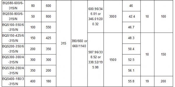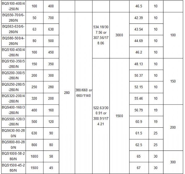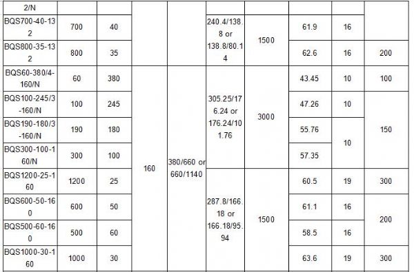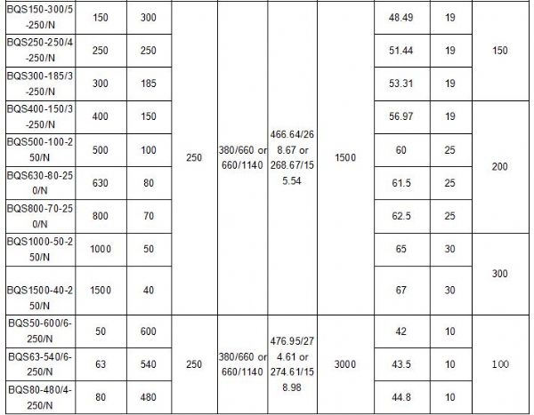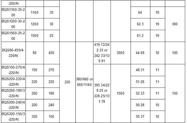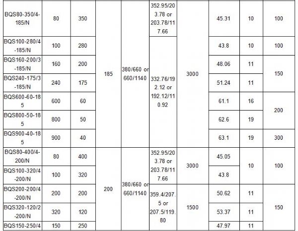| BQS60-260/2-110/N | 60 | 260 | 110 | 380/660 or 660/1140 | 212.2/122.52 or 122.52/70.74 | 3000 | 42.79 | 10 | 100 |